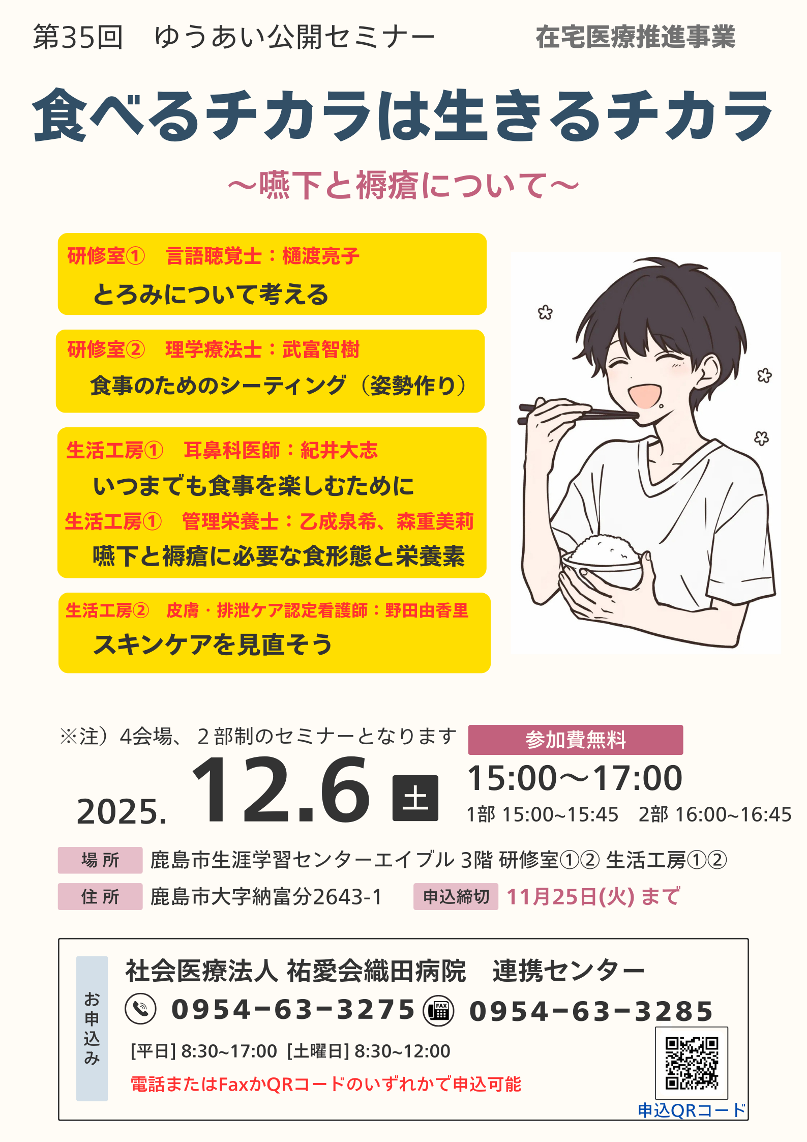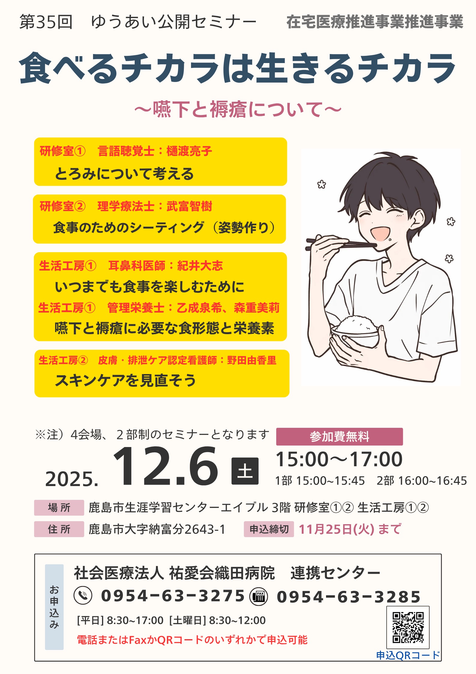 織田病院からのお知らせ 第35回ゆうあい公開セミナー開催のご案内 2025/11/13 お知らせ 下記の通り、公開セミナーを開催いたします。 ◆参加申し込みはこちら ◆織田病院ホームページはこちら お知らせ一覧