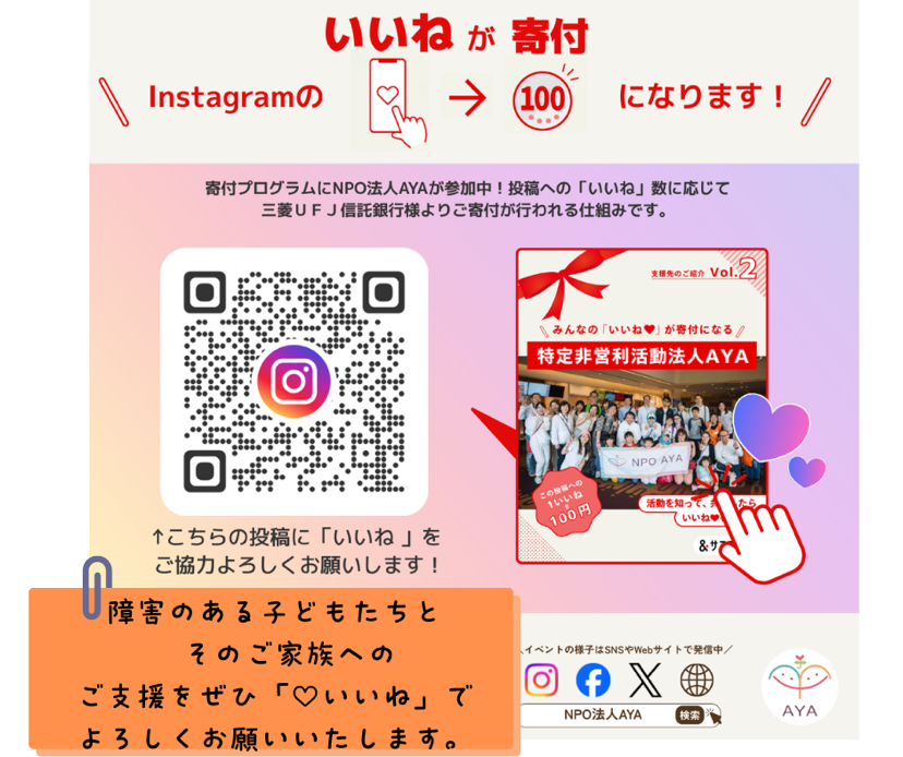 以下URLの投稿への「いいね」を「1いいね=100円」として寄付されます。活動内容に共感いただけましたら、ぜひ応援の気持ちを届けてみませんか。