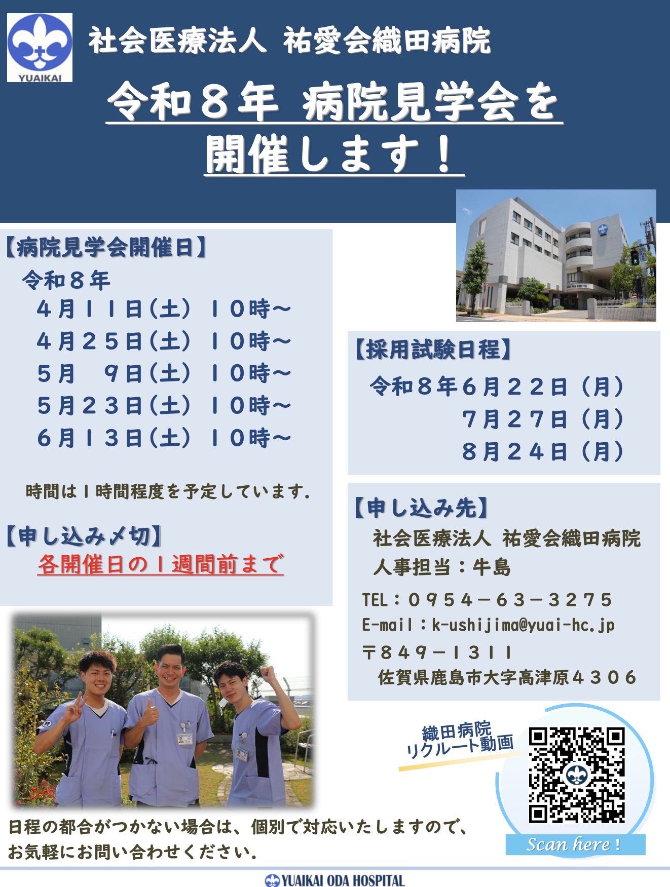 織田病院からのお知らせ 病院見学会開催のお知らせ 2026/03/02 お知らせ 令和9年度入職者の採用活動がスタートしました! 織田病院では、就職をお考えの方に向けて病院の雰囲気や働く環境を知っていただける「病院見学会」を開催します! 医療現場を直接体感できるこの機会、ぜひご参加ください。 詳細は添付ポスターをご覧ください ≪祐愛会 リクルートサイト≫ https://www.yuai-hc.jp/recruit/ ≪お問い合わせ先≫ 織田病院 人事担当:牛島 お知らせ一覧