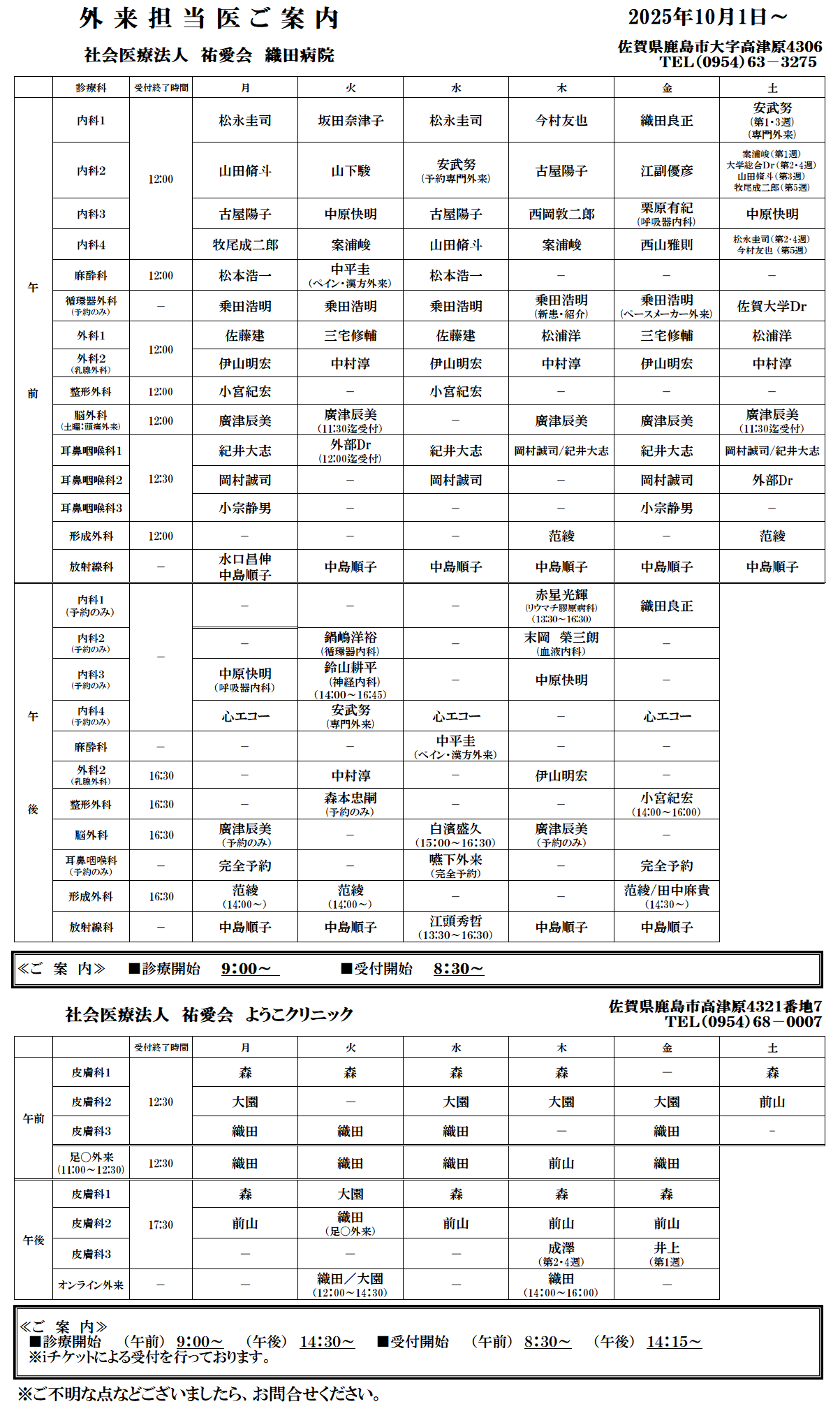 織田病院診療時間の案内については、各科で時間が異なりますので、担当表にて確認してください。
